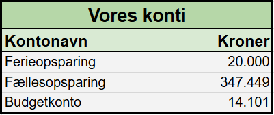 Vi har omdøbt vores “Husleje / A conto” konto, og den hedder fremadrettet “Budgetkonto”. Den betaler vores faste månedlige og kvartalsudgifter. Vi overfører 14.308 kr. hver måned til denne konto. Posten er steget, da vi fremover skal betale for vuggestue.